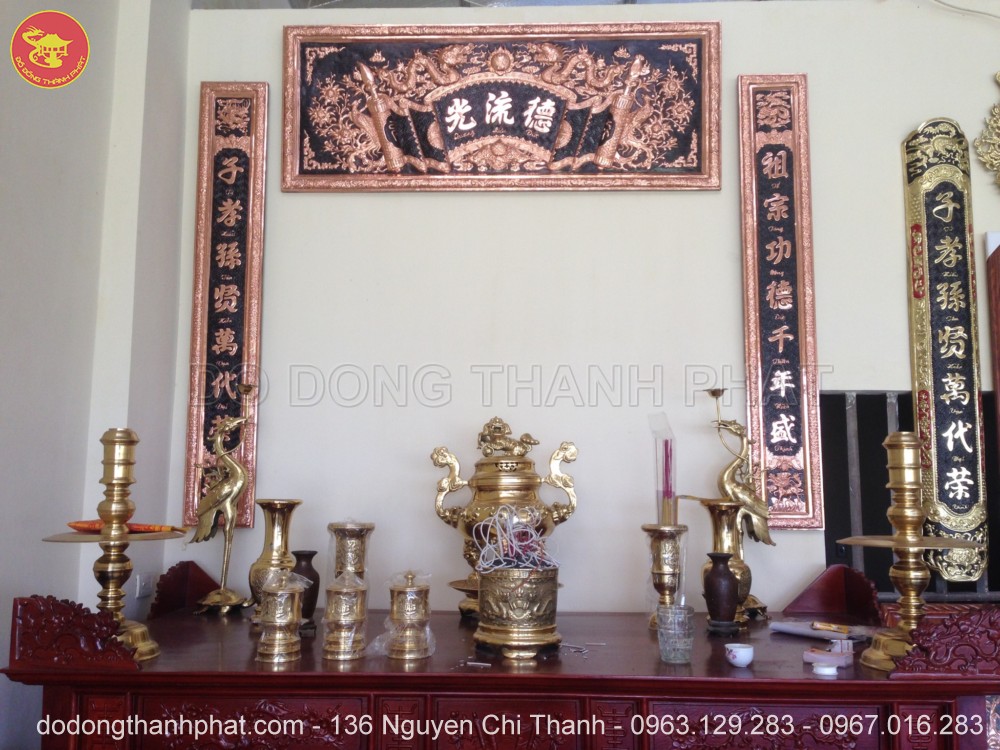 Bộ đồ thờ cúng bằng đồng đầy đủ gồm cả bộ hoành phi câu đối đồng