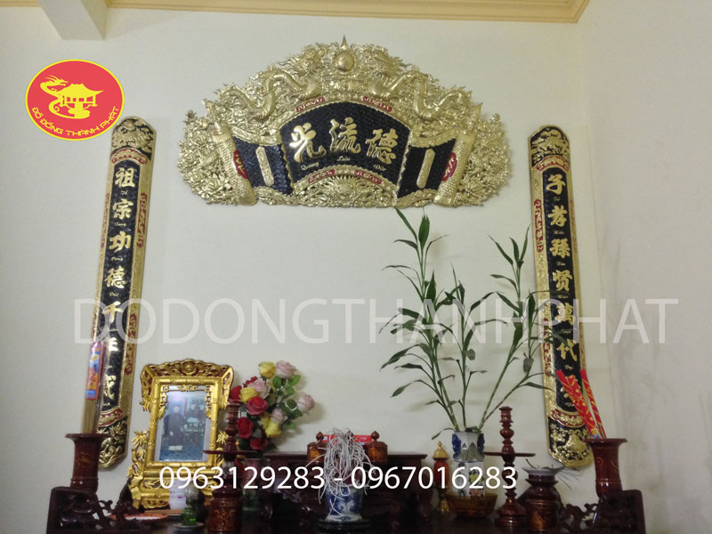 - Một số mẫu hoành phi câu đối đồng đẹp: “ Đức Lưu quan “ – “ Phụng Gia Tiên “ – “ Đường tổ phụng “,.., đi kèm với đâu câu đối với nội dung như sau: