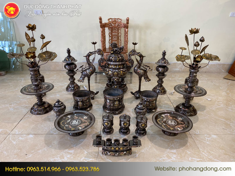 Quý khách xem lại hình ảnh tri tiết bộ đồ thờ cúng bằng đồng ngũ sự ngũ sắc 65 khảm 5 chữ vàng đẹp tinh sảo